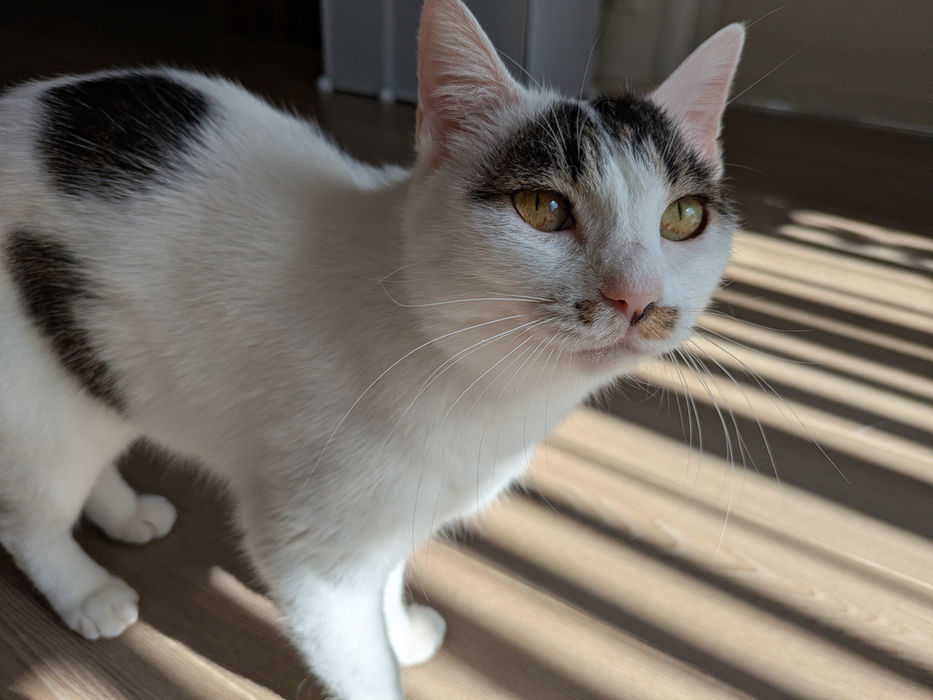 愛護センターから迎えた当初さ臆病な子で威嚇もありましたがねこ活生活で少しずつ人慣れが進み触れるくらいまでになりました。